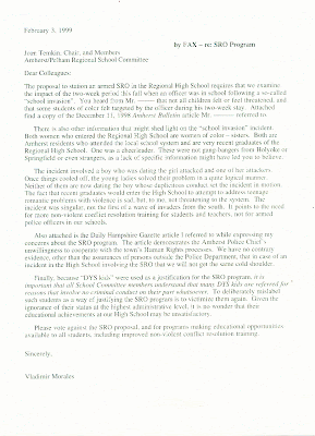 From letters written to the Amherst Bulletin and the Boston Globe, to leadership in trying to unite Amherst in solidarity with sister city Vieques during the struggle against the bombing of the Puerto Rican island, to a strong stance on the Amherst School Committee on many issues, to taking these issues to the town meetings: all this points to a dedicated citizen and activist who will be an asset on the Select Board of Amherst.